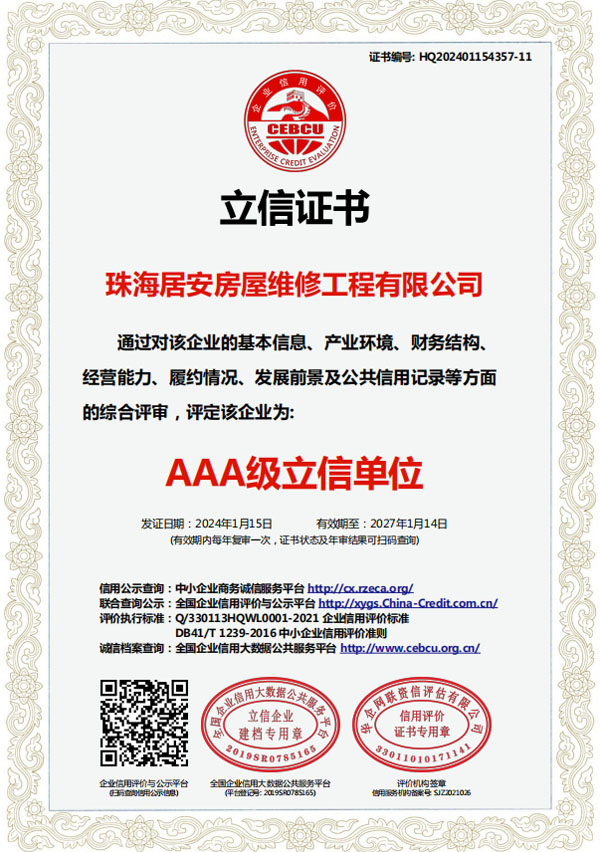 珠海居安房屋維修工程有限公司成立于2020年,是一家專注房屋維修的公司。我們擁有各類型專業(yè)人才,業(yè)務(wù)包括老舊建筑翻新改造、外墻空鼓修復(fù)、防水幕墻養(yǎng)護(hù)、外墻預(yù)置構(gòu)件拆除更換、供排水管網(wǎng)改造、墻面翻新、鋼制結(jié)構(gòu)建筑構(gòu)建及折除,外墻清洗及裝修裝飾。 公司自成立以來,始終堅(jiān)持以人為本、誠(chéng)信敬業(yè)的經(jīng)營(yíng)原則,與多家單位達(dá)成固定維修、養(yǎng)護(hù)清洗協(xié)儀,業(yè)務(wù)遍及廣州、東莞、中山、珠海等多個(gè)周邊城市。專業(yè)化團(tuán)隊(duì)尤其在墻面及窗邊防水工程業(yè)內(nèi)知名。…… >>> 更多內(nèi)容 |